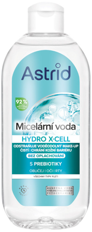 Popis produktu: Astrid micelárna voda Hydro X-Cell je ideálna pre všetky typy pleti a obsahuje 92 % prírodných zložiek, ktoré účinne čistia pleť, odstraňujú make-up a nečistoty. Pokročilé zloženie kombinuje jemné olejové a vodné čiastočky, ktoré odstraňujú aj vodeodolný make-up, a to bez vysušovania.
