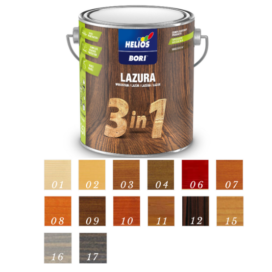"BORI lazúra 3in1" -Strednovrstvá lazúra je produkt určený na konečnú ochranu a dekoráciu drevených povrchov v exteriéri, ako sú okná, dvere, okná, ploty, obklady, zruby, záhradné domčeky, záhradný nábytok a podobne. Tento produkt kombinuje viacero vlastností, ktoré prispievajú k ochrane a zlepšeniu vzhľadu drevených povrchov.