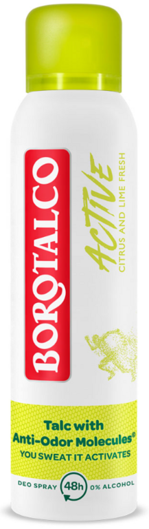 Dezodorant v spreji Borotalco Active so sviežou vôňou citrusu a limetky vás efektívne chráni pred neželaných pachom a potom až počas 48 hodín. Účinný systém Odor-Converter s postupným uvoľňovaním vône sa aktivuje počas pohybu. Čím viac sa potíte, tým je dezodorant Borotalco Active účinnejší. Navyše vďaka 0 % obsahu alkoholu je šetrný ku každej pokožke. Pre príjemný suchý a ošetrený pocit.