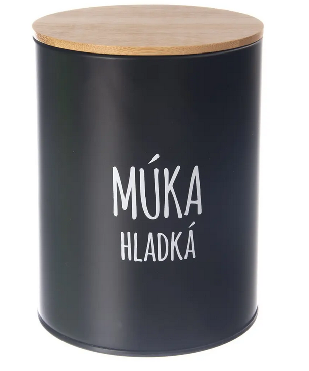 Dizajnová plechová dóza s matným čiernym povrchom – perfektná na hladkú pšeničnú, špaldovú, celozrnnú či kukuričnú múku.