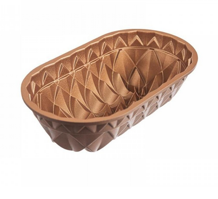 Táto oválna forma na pečenie s unikátnym vzorom a nepriľnavým povrchom PFLUON je perfektná na piškótové, trené aj kysnuté cesty či slané dezerty. Vyrobená z hliníka s atraktívnou medenou povrchovou úpravou – vnútri dvojitý nepriľnavý PTFE povlak, zvonku medený efekt – odolá teplotám až do +200 °C. Vhodná do elektrickej, plynovej aj teplovzdušnej rúry a po klasickom vymazaní a vysypaní múkou sa pečivo skvele vyklopí.