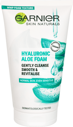 Garnier Skin Naturals čistiaca pleťová pena s Aloe vera a kyselinou hyalurónovou šetrne a hĺbkovo čistí pleť bez vysušenia. Vysoko penivá forma, ktorá obsahuje jemnú pružnú bariéru, chráni pokožku pred podráždením. Vysoké množstvo mikrobubliniek čistí pleť do hĺbky a odstraňuje nečistoty a mastnotu bez rozšírenia pórov. Hydratačná receptúra s kyselinou hyalurónovou a bio Aloe vera pleť upokojuje a zároveň vypĺňa jemné línie a vrásky. Pre žiarivú a hebkú pleť. Začnite svoju dennú rutinu s čistiacou penou od Garnier!