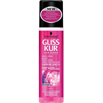 Regeneračný expres balzam na vlasy Gliss Kur Supreme Lenght v spreji je vytvorený špeciálne pre potreby dlhých vlasov so sklonom k štiepeniu. Receptúra s Micro obnovujúcimi lipidmi a výťažkom z pivoniek regeneruje poškodené vlasy po celej ich dĺžke a navracia im ich prirodzenú krásu. Bezoplachová starostlivosť. Až o 90 % menej rozštiepených končekov. Regeneračný balzam Expres GLISS KUR Supreme Lenght dodá vašim vlasom hebkosť a umožňuje ich ľahšie rozčesávanie už od prvých okamihov. Pre dosiahnutie optimálnych výsledkov odporúčame používať spoločne s ostatnými produktmi GLISS KUR radu Supreme Lenght.