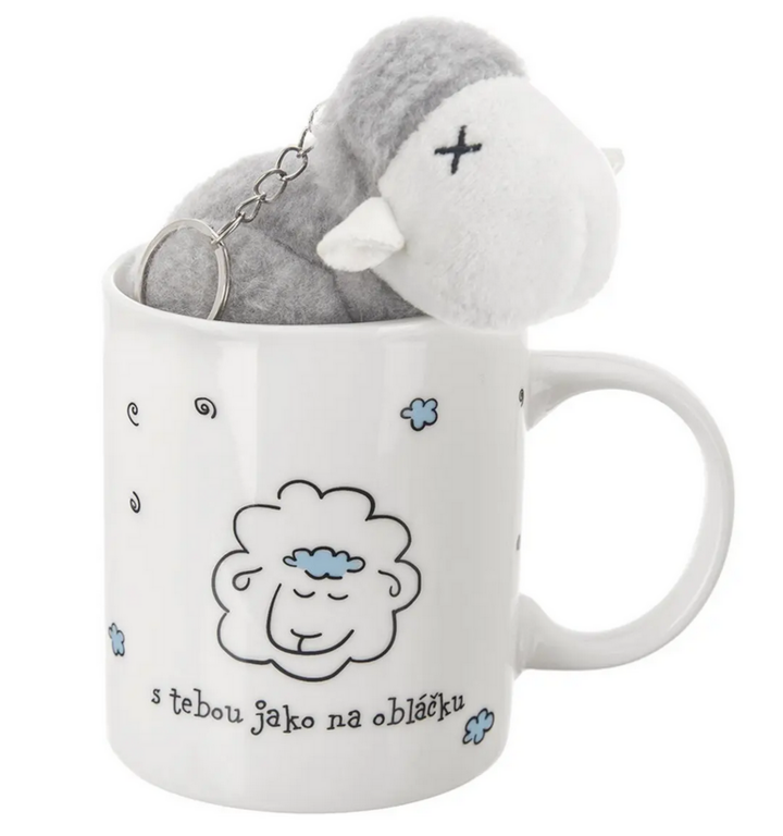 Roztomilý biely porcelánový hrnček s potlačou spiacej ovečky a nápisom "s tebou ako na obláčku" sa skvele drží vďaka šikovnému uchu. Objem 390 ml je ideálny na horúci čaj, lahodné kakao či polievku z hrnčeka.