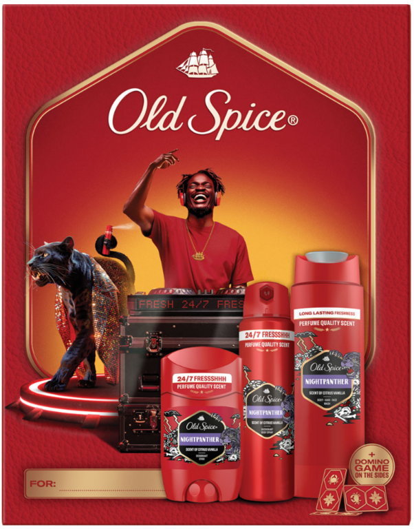 Old Spice NightPanther Xmas darčeková sada je originálnou kombináciou starostlivosti, štýlu a zábavy pre mužov s nevšedným vkusom a zmyslom pre humor. Obsahuje sprchový gél, tuhý dezodorant a antiperspirant v spreji, všetky s výraznou vôňou Night Panther. Táto vôňa spája tóny horkej čokolády, korenených citrusov a sladkej vanilky, čím vytvára nezameniteľný a sebavedomý charakter. Sada je ideálna pre tých, ktorí chcú zvýrazniť svoj štýl a zároveň si dopriať kompletnú starostlivosť s darčekovým balením, ktoré poteší aj svojím dizajnom.
