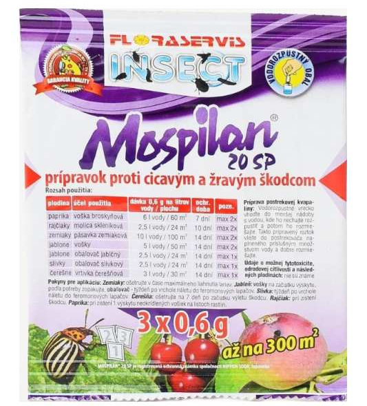 Mospilan 20 SP je insekticíd, ktorý prechádza celým profilom listu a účinkuje ako kontaktný a požerový jed vo veľmi nízkych dávkach. Má rýchle pôsobenie v poraste a vyniká dlhodobým účinkom proti širokému spektru živočíšnych škodcov. Tento systémovo pôsobiaci insekticíd je veľmi flexibilný k vyššej teplote počas aplikácie a je rozvádzaný nahor do novo narastajúcich listov rastlín.