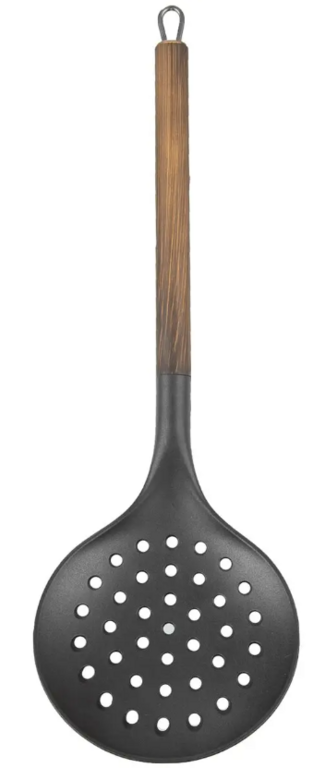 Naberačka je vyrobená z odolného termoplastu PBT, ktorý zvládne teploty až do 200 °C, a doplnená o nerezovú rukoväť s elegantným dekorom dreva. Je vhodná na každodenné používanie a šetrná k povrchom riadu.