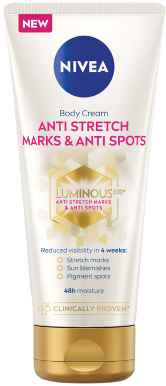 Nivea Telový Krém Luminous630 je navrhnutý pre intenzívnu starostlivosť o pokožku, ktorá vyrovnáva tón pleti a redukuje viditeľnosť strií a pigmentových škvŕn. Vďaka unikátnemu zloženiu s patentovanou účinnou látkou LUMINOUS630 poskytuje krém komplexnú starostlivosť pre zjednotenú a hydratovanú pokožku.