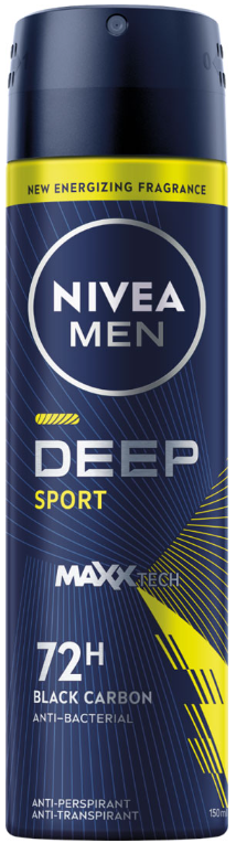 Antiperspirant NIVEA MEN DEEP Black Carbon poskytuje maximálnu ochranu a sviežosť počas celého dňa. Bez ohľadu na to, či sa venujete športu, stretávate sa na pracovnej schôdzke, alebo si užívate večer v meste, môžete sa na tento produkt spoľahnúť. Technológia s čiernym uhlím MaxxTech zabezpečuje okamžitú a silnú antibakteriálnu ochranu, pričom znižuje počet baktérií o viac ako 99,9 %* a poskytuje pocit sviežosti až na 72 hodín. Exkluzívna vôňa tmavého dreva dopĺňa jeho účinnosť. Sprej antiperspirant DEEP Sport je ideálnym spoločníkom pre každú príležitosť.