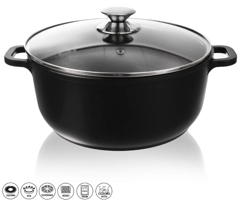 Hrniec GRANDE s objemom 7 litrov a sklenenou pokrievkou je spoľahlivým pomocníkom v kuchyni, ktorý vám umožní variť, smažiť, dusiť, opekať a zapekať jedlá s minimálnym použitím tuku. Jeho masívna konštrukcia a kvalitný nepriľnavý povrch PFLUON GRANIT zabezpečujú, že pripravované jedlá sa neprilepia k povrchu hrnca a pokrm sa nepripeká.