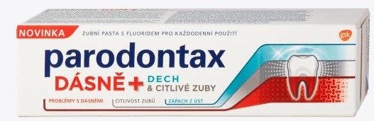 Zubná pasta Parodontax Gum + Breath & Sensitivity zabezpečuje kompletnú ochranu o zuby a ďasná. Obsahuje unikátne zloženie, ktoré napomáha pri problémoch s ďasnami, citlivosti zubov a zápachu z úst. Zameriava sa na bakteriálny povlak usadený medzi zubami, ktorý spôsobuje zápal a recesiu ďasien. Zároveň vytvára ochrannú bariéru proti citlivosti zubov. Je vhodná na denné použitie. Zubná pasta s fluoridom Parodontax ďasná + dych & citlivé zuby so sviežou mätovou príchuťou s účinkom na zdravie ďasien a proti citlivosti zubov.