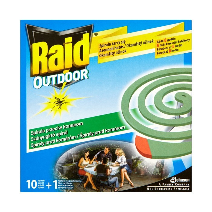 Raid špirála proti komárom, balenie obsahuje 10 ks + praktický stojan. Insekticídna špirály proti komárom vás bezpečne ochráni až 8 hodín, najmä pre domáce použitie. Je ľahko použiteľná. Nezhasína ani v miernom vetre. Spotrebováva sa tak, ako potřebujete.Účinná tiež na záhradách, na terasách, balkónoch alebo pri táborení. Jedna špirála ochráni až 10 m2 aj vo vetre, iba veľmi silný vietor môže znížiť jej účinok.