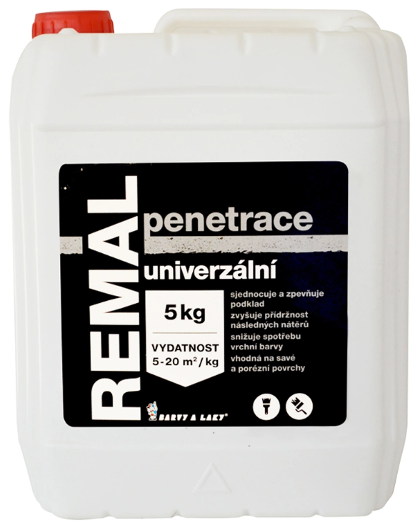 REMAL univerzálny penetračný náter 5kg. REMAL PENETRÁCIA AKRYLÁTOVÁ UNIVERZÁLNA sa používa ako základný penetračný náter na nasiakavé podklady (omietky, drevo, atd.) pre zníženie nasiakavosti a zároveň pre zlepšenie priľnavosti vrchného náteru latexových alebo maliarskych farieb.