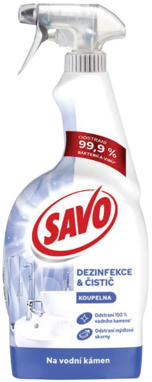 Savo dezinfekčný sprej do kúpeľne je vysoko účinný prípravok určený na odstraňovanie vodného kameňa* a mydlových škvŕn zo všetkých umývateľných povrchov v kúpeľni. Tento produkt nielenže rýchlo a ľahko čistí, ale tiež dezinfikuje, pričom odstraňuje až 99,9 % baktérií a vírusov**. Po použití zanecháva vašu kúpeľňu s dlhotrvajúcou sviežou vôňou, ktorá naplní celý priestor čistotou a sviežosťou.