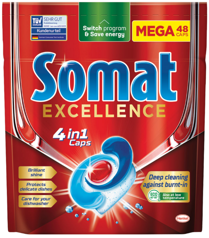 Somat Excellence kapsuly do umývačky riadu sú 4v1 prémiovým prostriedkom na umývanie riadu. Sú vyrobené z prášku a obsahujú 3 jedinečné pevné gélové komory v biologicky odbúrateľnej fólii, ktorá sa rozpustí vo vode. Tieto kapsuly sú navrhnuté tak, aby poskytovali účinné čistenie riadu a zabezpečovali lesklý vzhľad.