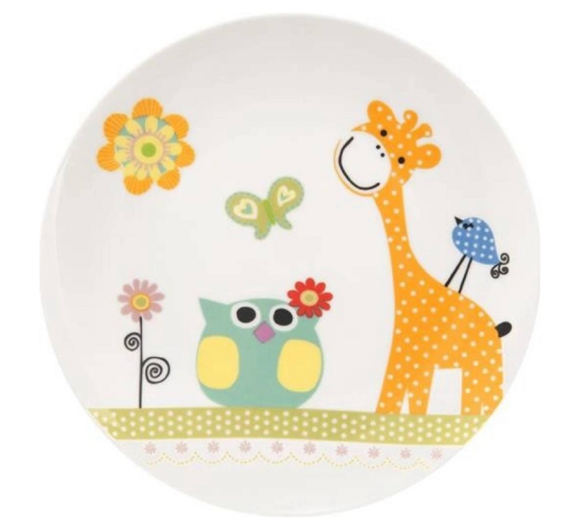 Porcelánový plytký tanier s milým motívom žirafy a jej kamarátky sovičky poteší všetkých malých nezbedníkov. S priemerom 21 cm je ideálny na servírovanie hlavného jedla, desiaty, toastov, ovocia či zeleniny.