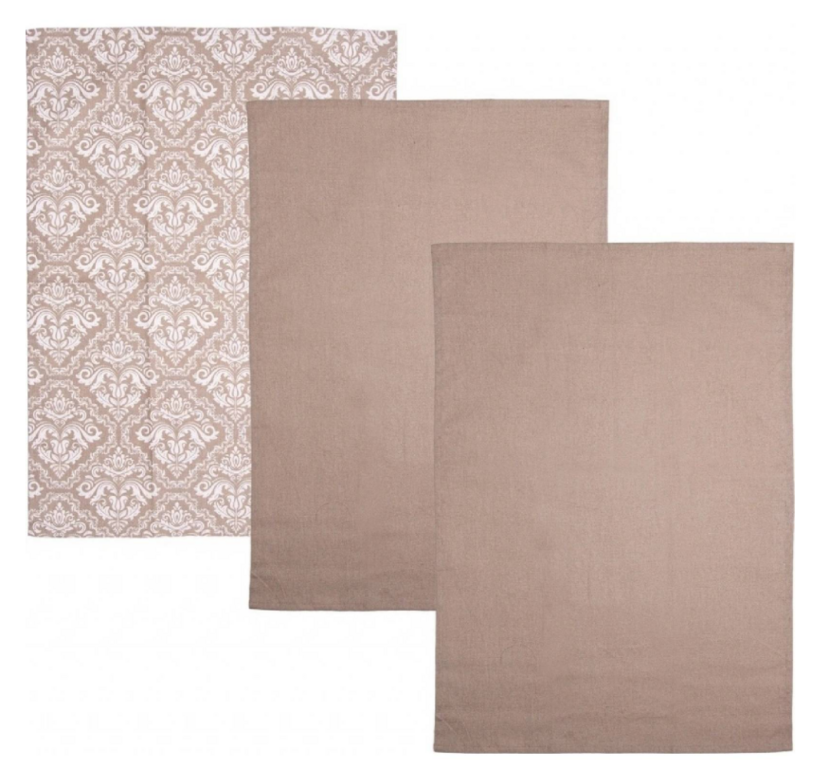 Balenie obsahuje 3 kusy béžových utierok – dve jednofarebné a jednu so zámockým vzorom, ktoré spolu vytvárajú elegantný a nadčasový vzhľad. Utierky sú vybavené pútkami na zavesenie, takže ich budete mať vždy poruke.